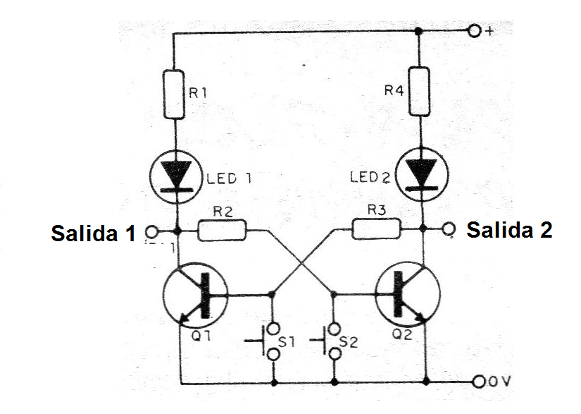En este circuito, la polarización de un transistor depende del otro de tal forma que, si un transistor está conduciendo (LED encendido), el otro no puede ser polarizado para conducir y tendrá su LED apagado.