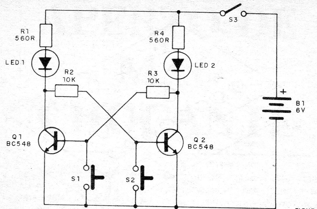 Si aprieta el interruptor S2 por un breve instante, es el transistor Q2 que deja de conducir, llevando así polarización a Q1 que "dispara" y hace que su LED 1 se encienda.