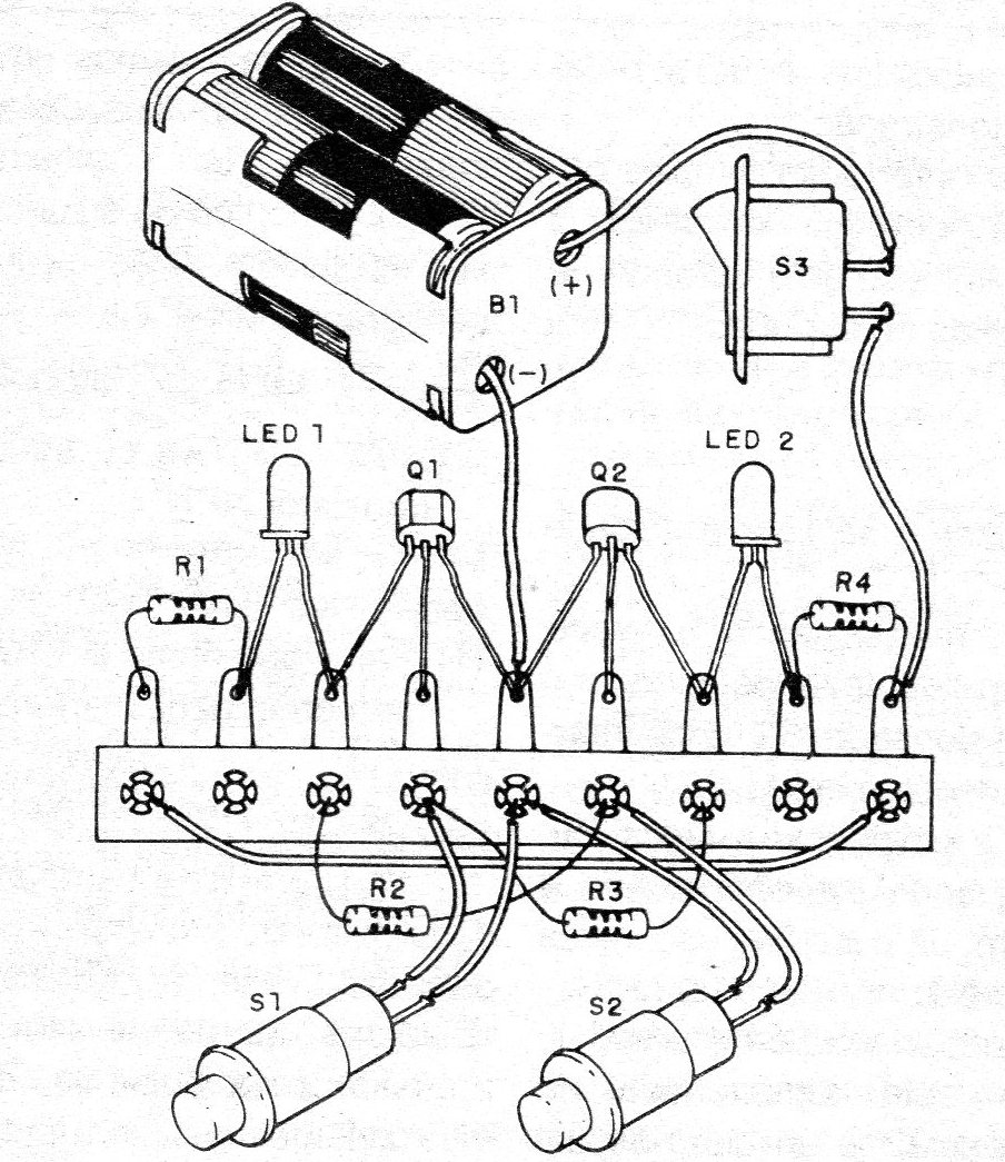 S1 y S2 son interruptores de presión del tipo botón de campana, pero incluso los interruptores hechos con chapas de metal y clavos se pueden utilizar en un montaje de demostración.