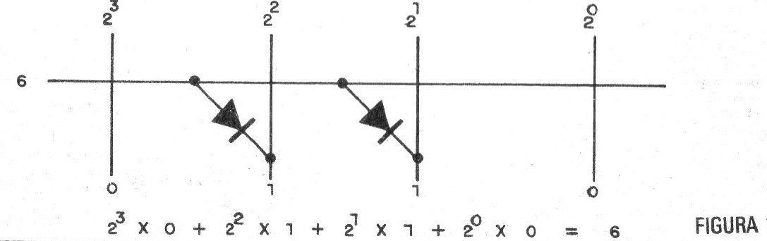 Así, la presencia de un diodo en un cruce de conexiones representa un "1" y su ausencia un "0". Para programar el número 6, por ejemplo, usamos 2 diodos en la forma mostrada en la fig. 1.