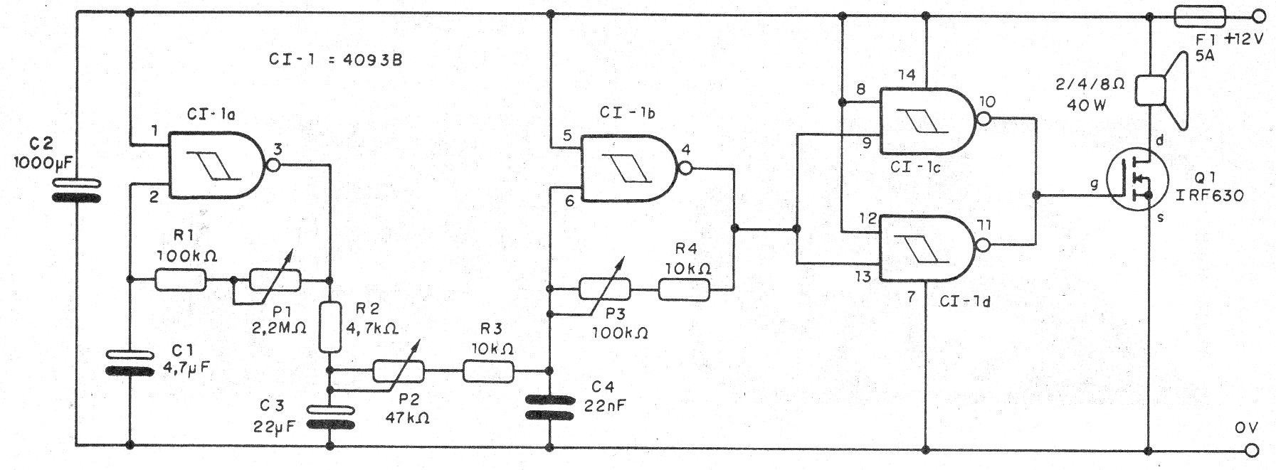 Para generar el tono modulado se utiliza la segunda puerta del 4093, con la frecuencia básica ajustada en P3.