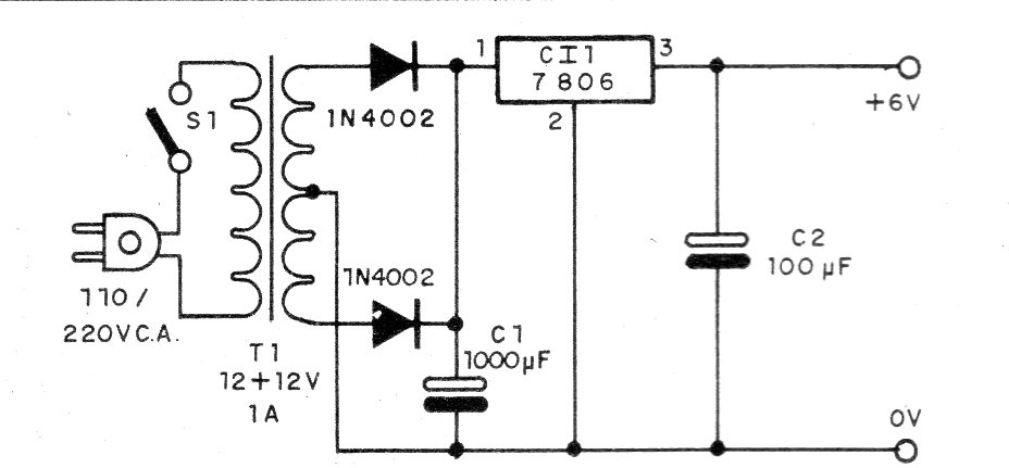 Esta fuente es ideal para sustituir 4 pilas en aparatos que necesiten 6 V de alimentación bajo corrientes hasta unos 500 mA. La corriente máxima depende únicamente del transformador utilizado. La fuente se estabiliza y se protege.