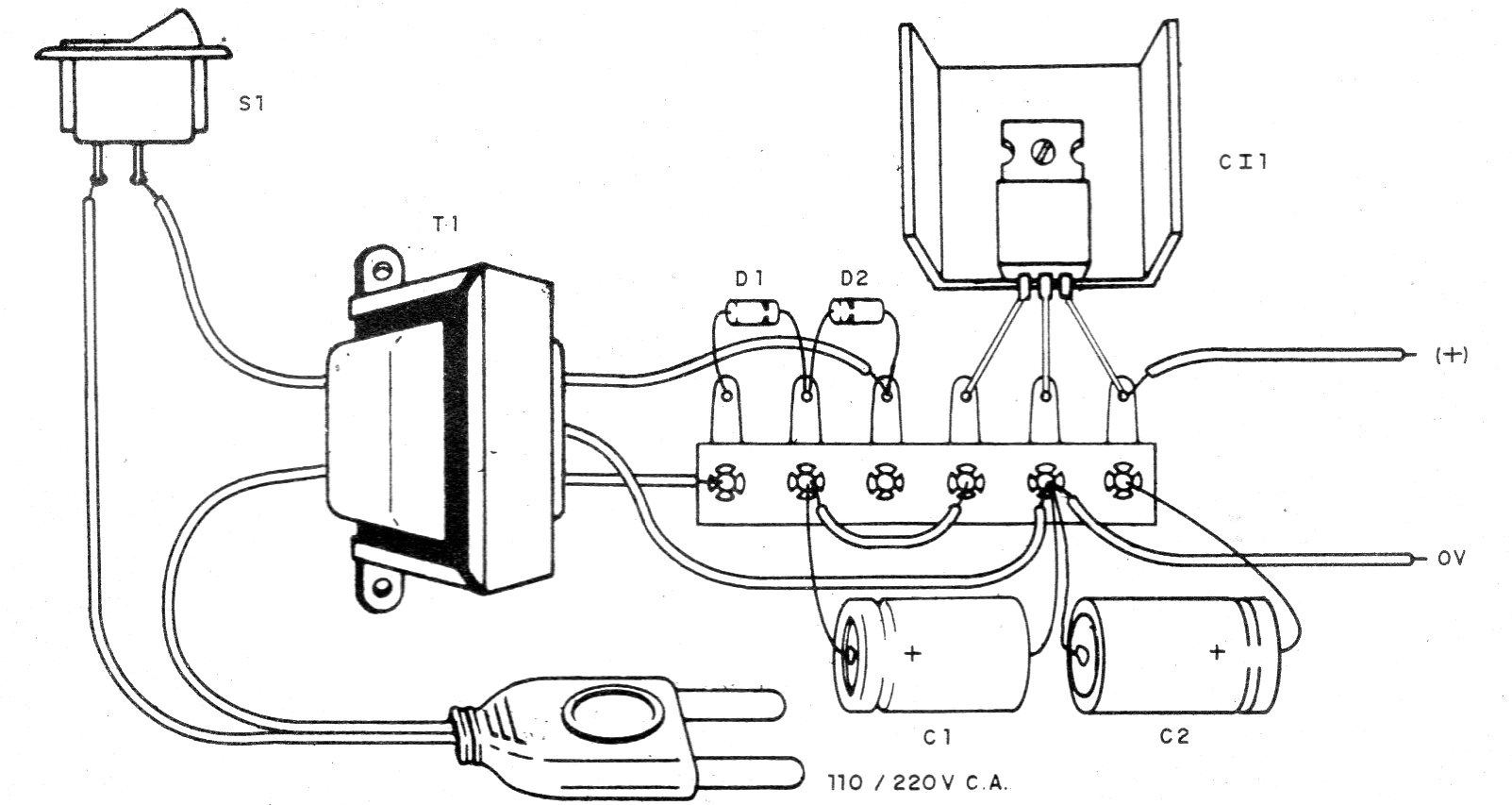 El transformador debe tener bobinado primario según la red de energía y secundaria de 9 + 9 V a 12 + 12 V con corriente entre 200 y 500 mA, según el máximo deseado en la salida.