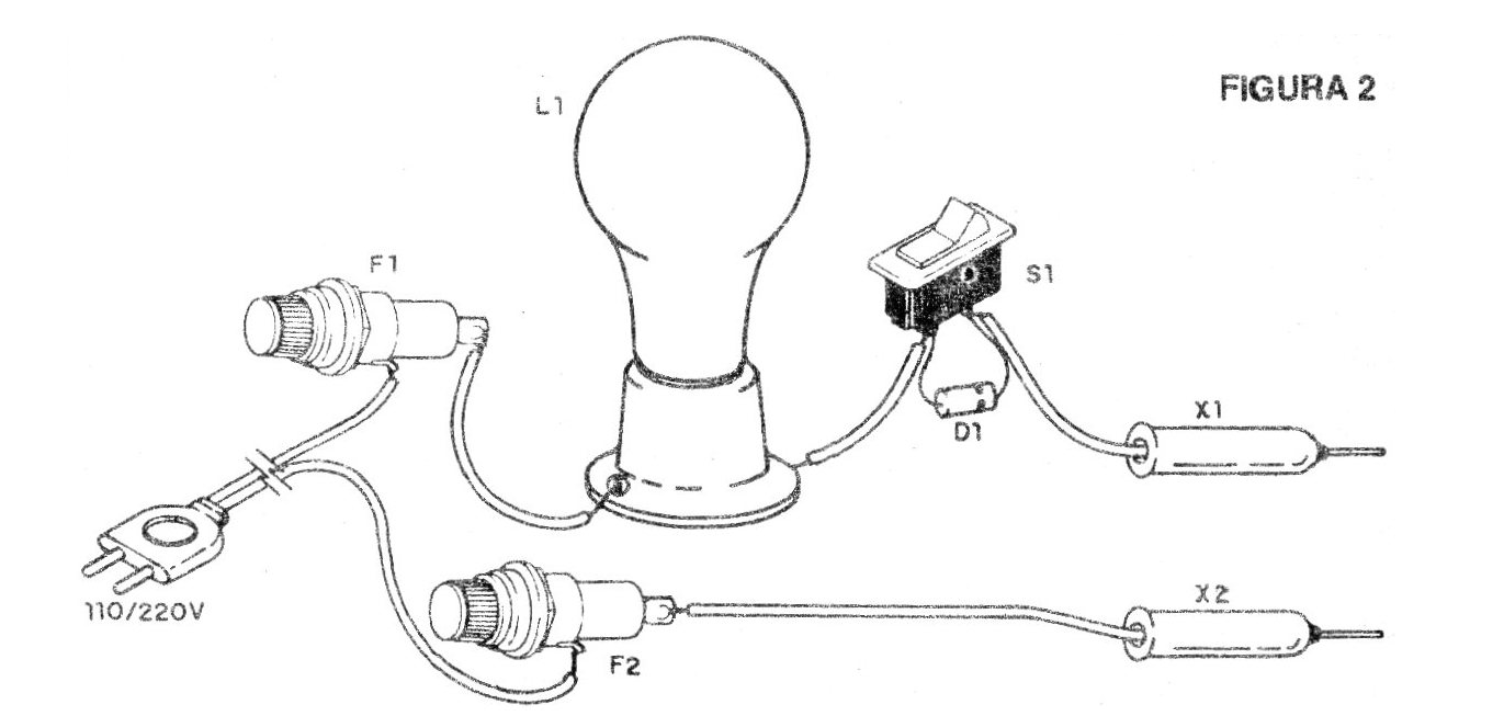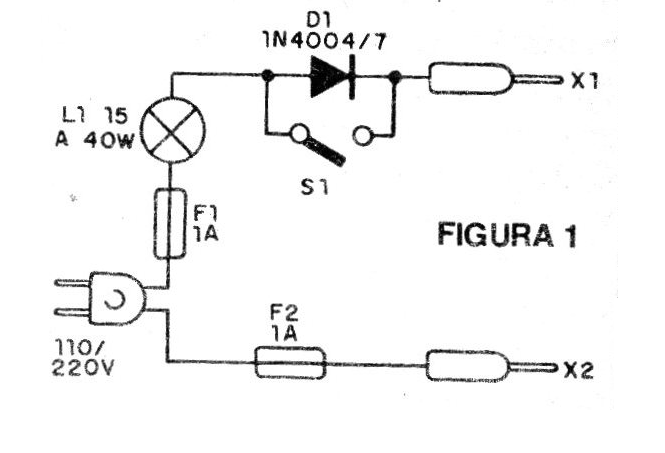 La lámpara de prueba que describimos todavía tiene un diodo que se coloca en el circuito por la apertura de S1 y que permite la aplicación de tensiones continuas en los dispositivos probados.