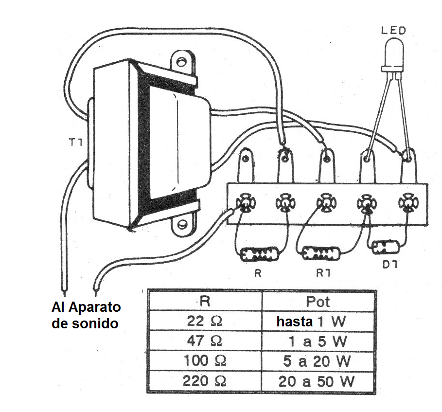 El aparato se puede utilizar con amplificadores de hasta 50 W y el resistor conectado en serie con el transformador dependerá de la potencia según la tabla dada junto con el montaje.