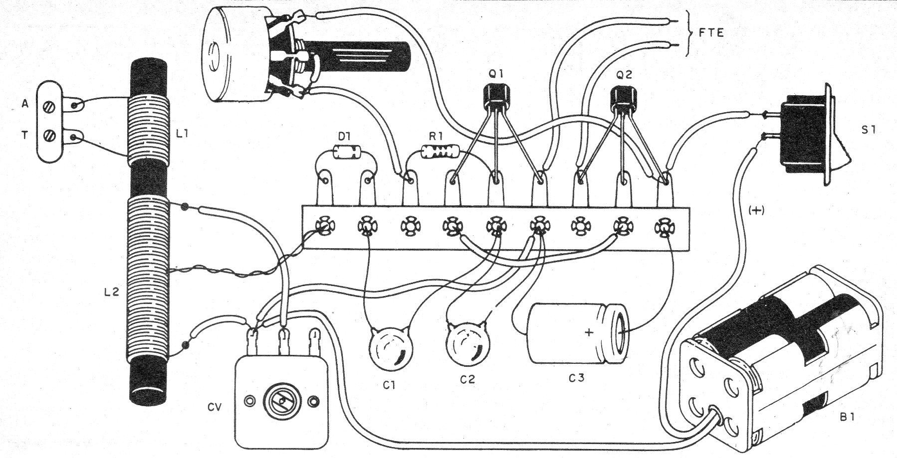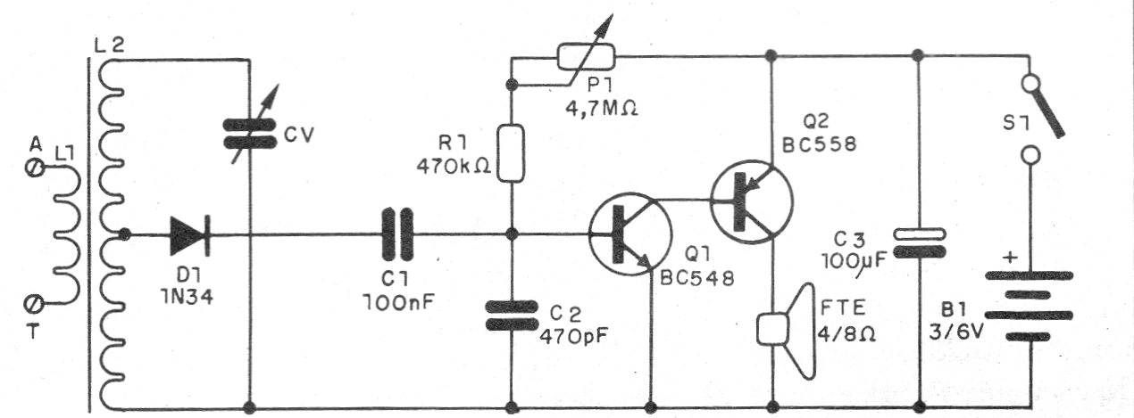 En la figura 1 tenemos el diagrama completo del receptor de dos transistores para el rango de ondas medias.
