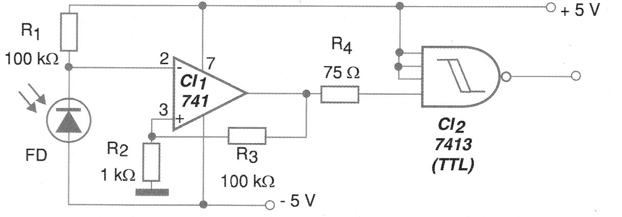 La finalidad del circuito mostrado en la figura 1 es proporcionar señales compatibles con tecnología TTL a partir de señales ópticas captadas por el foto-diodo. El circuito se puede utilizar como shield para microcontroladores.