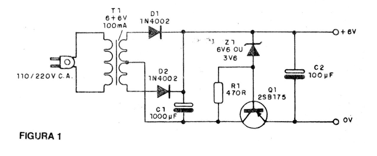 En este montaje usted puede utilizar transistores PNP de chatarra, obteniendo con ellos una excelente regulación de la tensión de salida de su fuente. Para tipos de pequeña potencia, como el 2SB175, OC74, 2SB54, la corriente máxima indicada es de 50 mA, pero para transistores mayores, como el AC128 o AC188, puede requerir hasta 100 mA sin problemas.