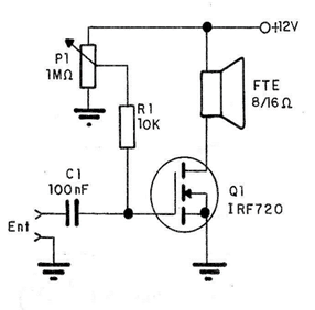 El circuito que se muestra a continuación muestra una aplicación lineal del FET de potencia, donde lo usamos como un amplificador de clase A, con una salida cercana a los 2 watts en un altavoz pequeño. El trimpot debe ajustarse para obtener una corriente de reposo de aproximadamente 50 a 100 mA en el altavoz. De esta manera, la tensión en el drenaje del transistor será diferente del suministro. Variaciones en la tensión base producirán entonces variaciones en la corriente de drenaje con la reproducción de la señal con excelente fidelidad.