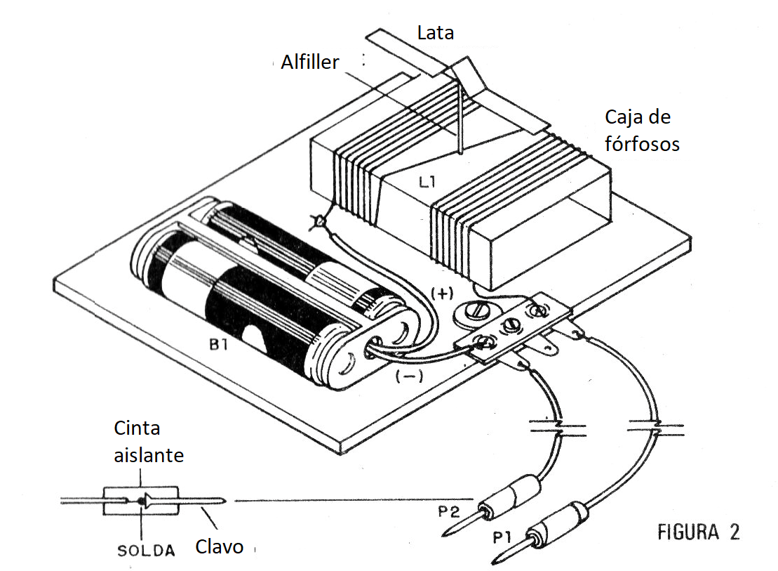 Lo que este circuito utiliza es un galvanómetro elemental hecho con una caja de fósforo, un alfiler y una aguja de latón. La bobina se enrolla con hilo fino en la forma indicada en la figura 2 que da detalles del montaje. Esta bobina tiene de 10 + 10 a 50 + 50 vueltas de hilo.