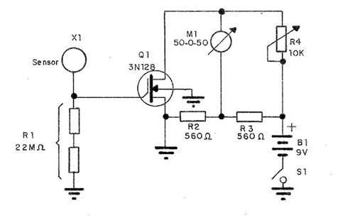 La energía proviene de una batería común y el sensor es una pequeña placa o bola de metal de aproximadamente 2 cm. El cable de conexión a este sensor debe ser muy corto para no afectar el funcionamiento del circuito. El instrumento indicador es un microamperímetro 50-0-50 RA, es decir, del tipo con el cero en el centro de la escala. La operación se realiza acercando el sensor al objeto cargado, pero sin tocarlo nunca, ya que al tocarlo se puede quemar el componente (FET).