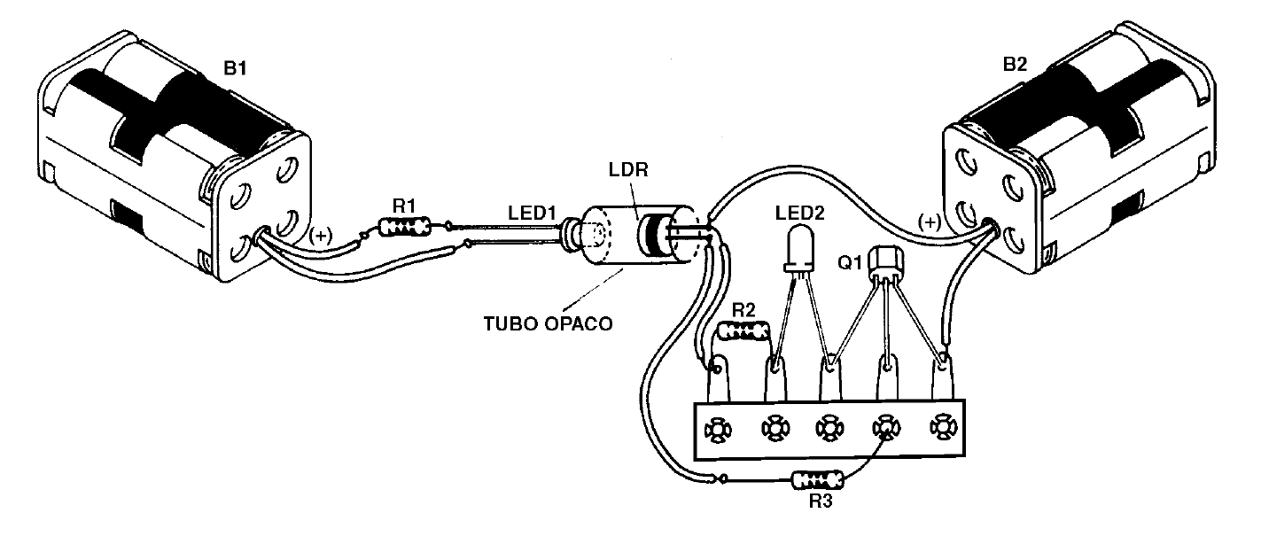 Cuando coloque las pilas en el soporte 1 (B1), veremos que el LED2 se enciende. Esto significa que el LED1 en el interior del tubo encendió y excitó el LDR, haciendo que el transistor condujera alimentando así el LED2.