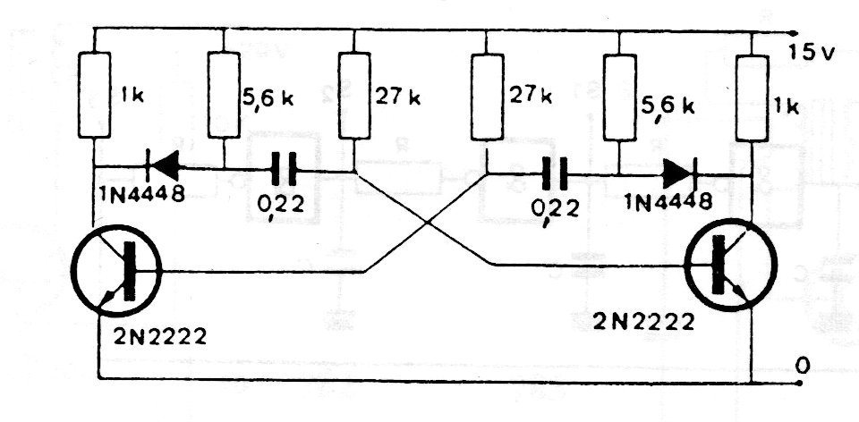 Esta configuración, que aparece en otros puntos de este sitio, fue encontrada en una documentación de los años 80. El circuito puede ser implementado con transistores equivalentes, como los BC548, y la frecuencia depende de los capacitores usados. La alimentación se puede cambiar en un rango de valores.