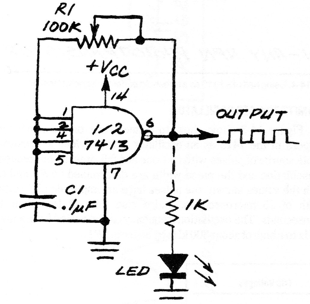 En la figura tenemos el modo de utilizar una puerta TTL 7413 como oscilador de baja frecuencia haciendo un LED parpadeante. El circuito es de una documentación americana antigua, debiendo ser alimentado con una fuente de 5 V. R1 ajusta la frecuencia.