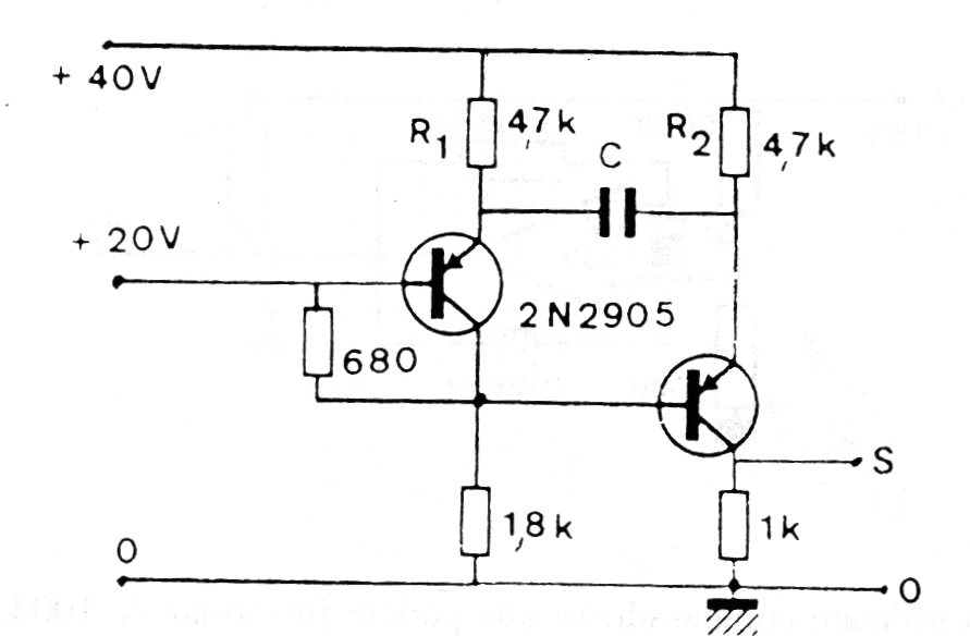 Esta configuración distinta de asimétrica utiliza transistores acoplados por el emisor. La tensión es elevada y los transistores aceptan equivalentes. La frecuencia depende del capacitor C siendo aproximadamente T = 0,69 RC el período.