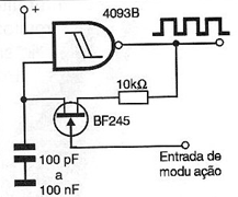 El oscilador rectangular presentado en la figura hace uso de una de las cuatro puertas NAND de un circuito integrado 4093 y se caracteriza por poder ser modulado en frecuencia. Una señal aplicada a la conducción del transistor de efecto de campo BF245 (FET) altera la resistencia del circuito de carga y descarga del condensador que determina la frecuencia de la señal producida. El circuito puede generar señales que van desde algunos hertz hasta cerca de 4 MHz con alimentación de 10 voltios. La señal moduladora puede variar de -1 a +6 V de amplitud. El resistor de 10 k ohms se puede cambiar en función de la profundidad y la banda de modulación deseada. La alimentación para el circuito se puede hacer con tensiones de 3 a 15 volts y la señal generada tiene forma de onda rectangular.
