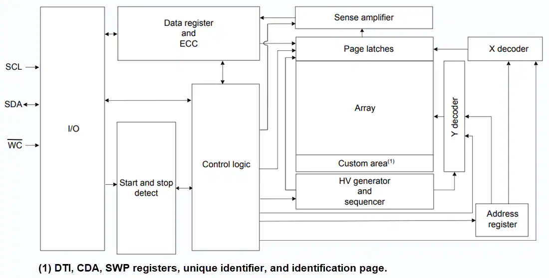 La EEPROM STMicroelectronics M24M02E-U 2MB I²C-Compatible está organizada en 256K bits x 8 bits. Puede operar con una tensión de alimentación de 1,6 V a 5,5 V y una frecuencia de reloj de hasta 1 MHz en un rango de temperatura ambiente de -40 °C a +85 °C. El dispositivo ofrece tres registros de 8 bits: el registro de Identificador de Tipo de Dispositivo (DTI), la Dirección de Dispositivo Configurable (CDA) y el registro de Protección contra Escritura por Software (SWP). El dispositivo también incluye una página de identificación de 256 bytes. Esta página adicional almacena un número de serie único de 128 bits (16 bytes) programado de fábrica, que se bloquea en modo de solo lectura al momento del envío. La unicidad del número de serie está garantizada en toda la gama de EEPROMs seriales fabricadas por STMicroelectronics, lo que proporciona un identificador único.
