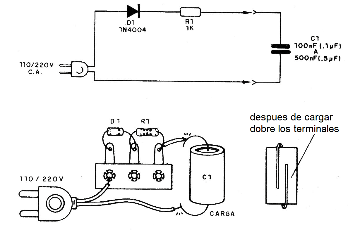 El circuito cargador consiste en un diodo y un resistor, donde el condensador se conecta durante unos segundos a la carga.