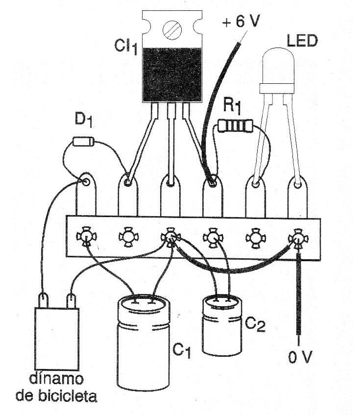 Observe que el dínamo tiene un sentido correcto de rotación para proporcionar la tensión con la polaridad necesaria para la alimentación del circuito. También hay que tener al menos 2 V por encima de la tensión de salida del regulador para que el circuito integrado funcione convenientemente en su función.