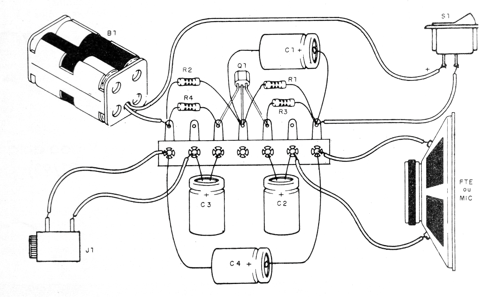 El transistor es un BC558 o cualquier equivalente PNP. Para la salida se debe utilizar un cable blindado con enchufe de acuerdo con la entrada del amplificador.