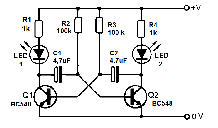 En nuestro caso, el cambio de estado hace que los LEDs controlados por los transistores queden encendidos y apagando de modo alterna.