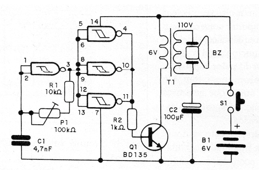 En la figura 1 tenemos el diagrama completo del aparato que se basa en un circuito integrado CMOS 4093.