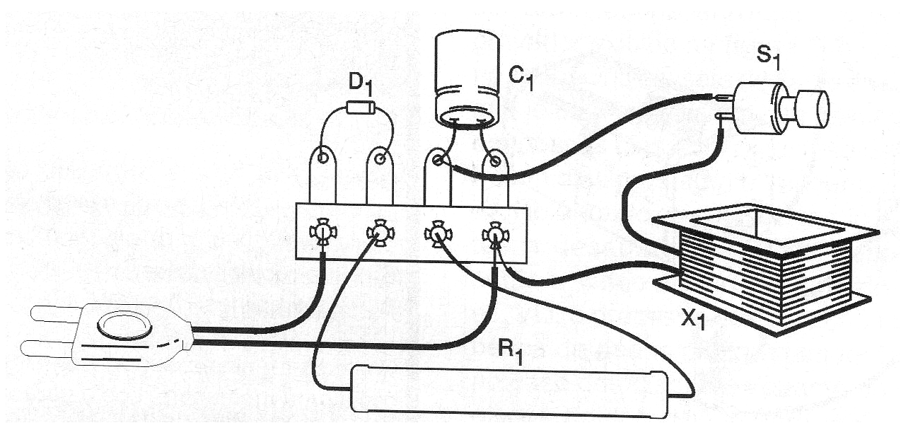 La bobina X1 consiste en 50 a 100 vueltas de alambre común o esmaltado grueso en un carrete de transformador. Se puede aprovechar el devanado de baja tensión (5 a 12 V) de un transformador cuyo primario esté quemado.