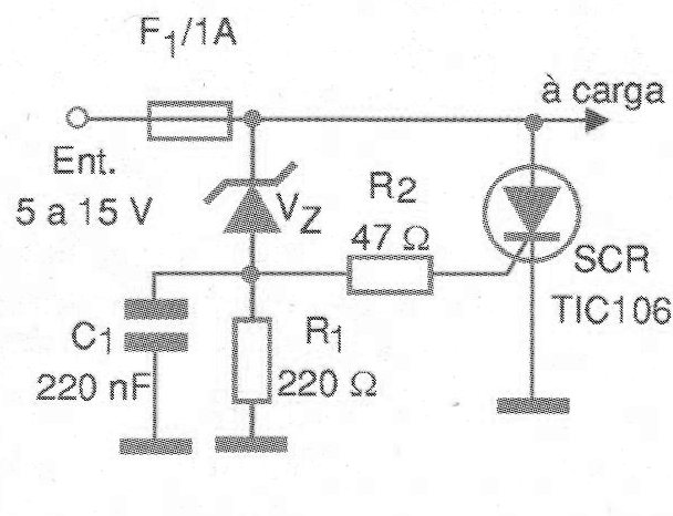 Esta acción rápida de interrupción del circuito puede ser importante en los casos en que tenemos un aumento lento de la corriente en caso de problemas, lo que puede llevar a los componentes más frágiles la quema. Vz es un zener de 400 mW o más y el SCR TIC106 no necesita radiador de calor ya que el tiempo de conducción de este componente es muy pequeño.