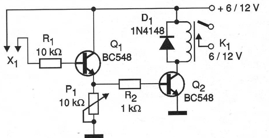 Cuando el líquido toca los dos hilos al mismo tiempo, la caída de la resistencia polarizará los transistores en el sentido de llevar el relé al disparo.