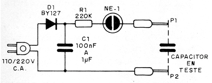 Con este circuito podemos probar capacitores no electrolíticos (poliéster, cerámicos, styroflex, etc.) con tensiones de aislamiento mayores que 100 V. El circuito aplica una tensión elevada en el capacitor y si hay fugas, la lámpara neón de muy bajo consumo se enciende. Para la red de 220 V los capacitores en prueba deben tener tensión de trabajo de al menos 300 V.