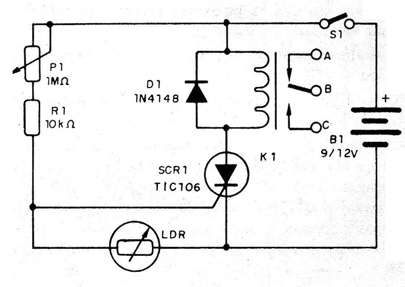 Utilizando un SCR en lugar del transistor podemos hacer una alarma de corte de luz con traba, o sea: cuando la luz es cortada el relé dispara y así permanece aunque la luz sea restablecida en el LDR. El circuito es muy sensible y puede ser utilizado como alarma, en demostraciones y en muchas otras aplicaciones, tales como un sensor de falta de luz con "memoria".