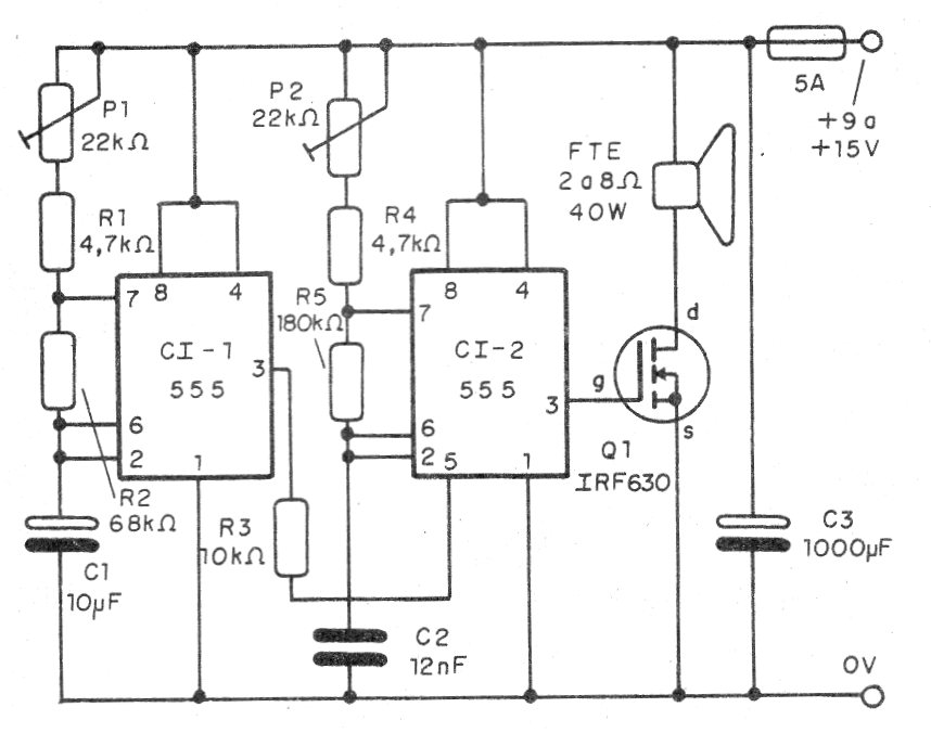 Lo que tenemos son dos osciladores con el 555, siendo un responsable de la modulación y el otro responsable por el tono final.