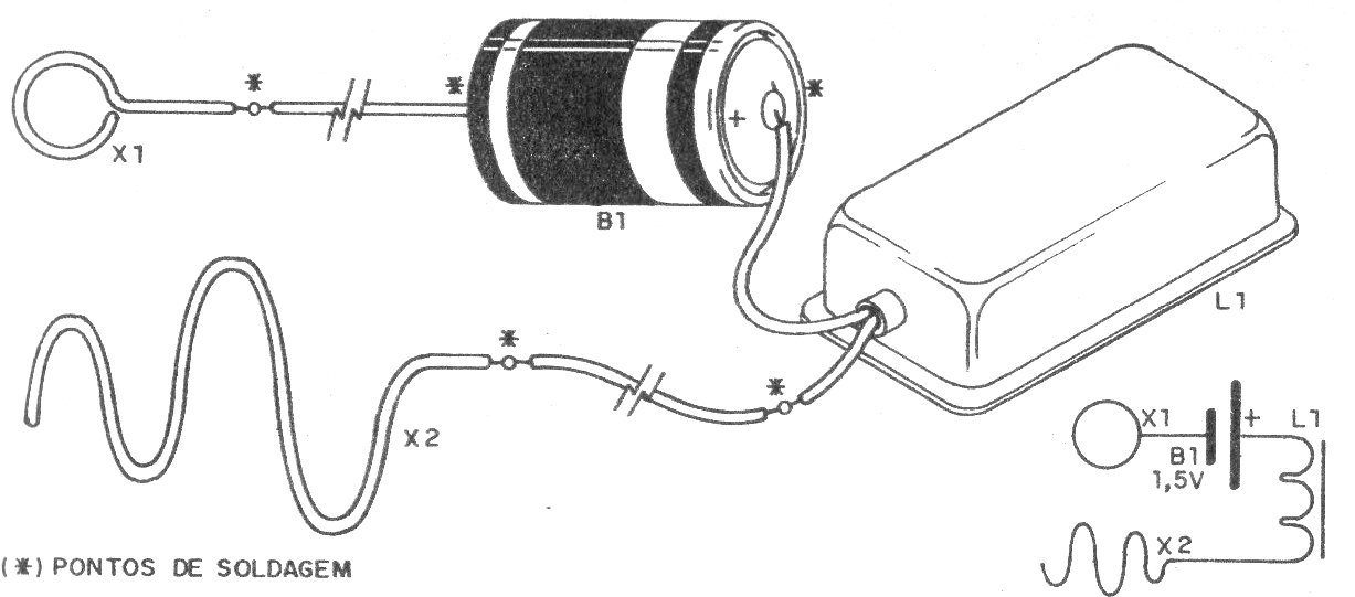 Pase, sin chocar, la argolla por el hilo tortuoso. Si usted se equivoca, el inductor genera una alta tensión que le da un castigo bien "chocante". Inofensivo, pero interesante, este juego produce choque eléctrico en quien se equivoca.